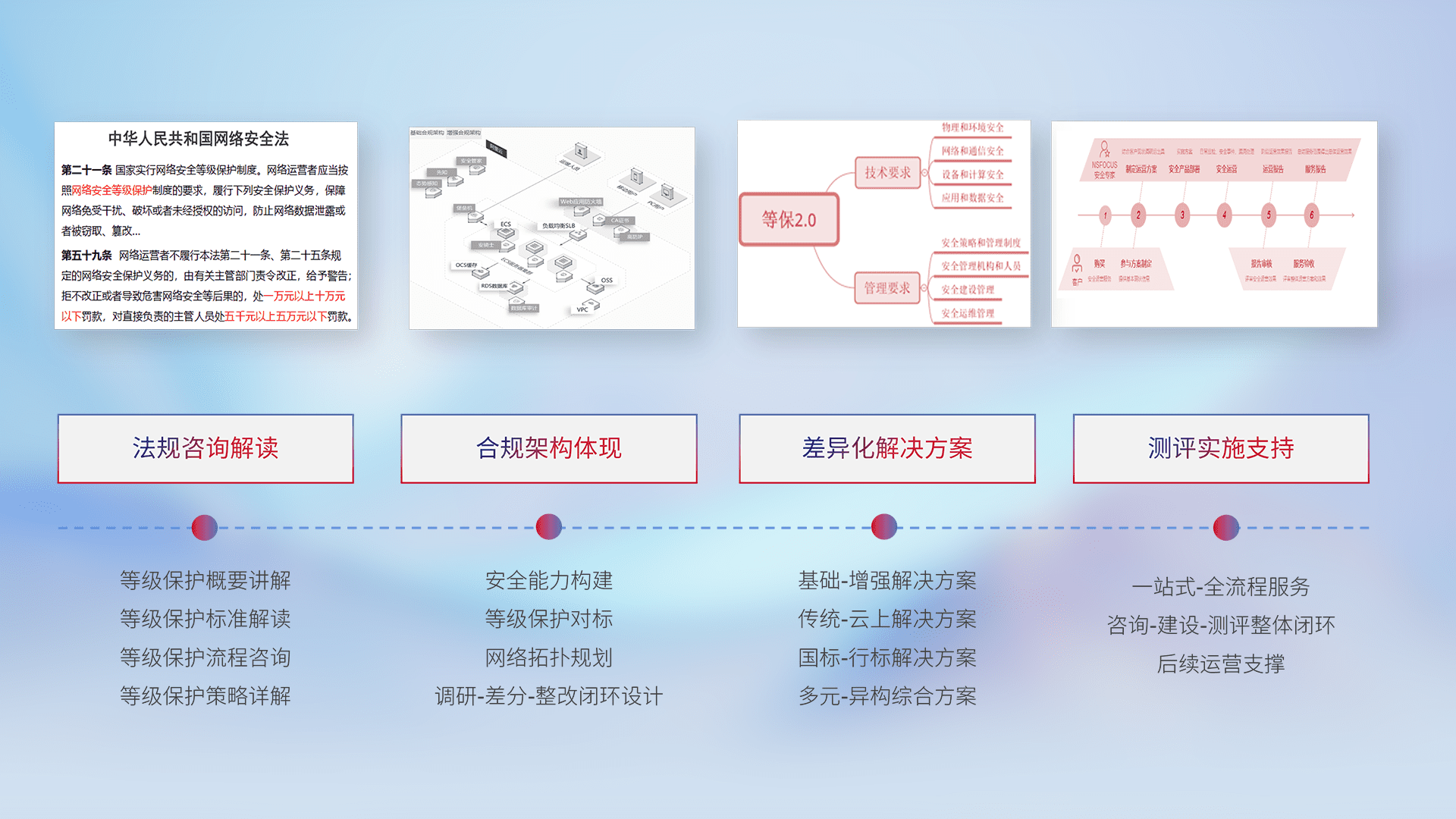 通过专业的法律咨询解读、、合规架构体现、、、差异化解决方案、、测试实施支持等服务,,为客户量身打造等保合规体系。。。。